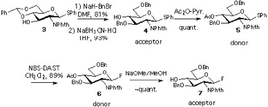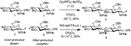 In the initial attempt to demonstrate the feasibility of the orthogonal strategy, N-phthaloyl (Phth) protected glucosamine (GlcN) derivatives were chosen as the monosaccharide units. This decision was based solely on the assumption that any stereochemical ambiguity could be eliminated by the strong 1,2-trans-directing nature of the NPhth group. [8] However, it is to be stressed that the basic principle should be applicable to a wide variety of oligosaccharide structures. In addition, the biological significance of β-1,4 linked oligomers of glucosamine (e.g. chitin) are well recognized. [9] Also, the hydroxyl group at the C-4 position of GlcN is known to be relatively less reactive. [10] Therefore, the construction of this type of oligosaccharide is a challenging task.