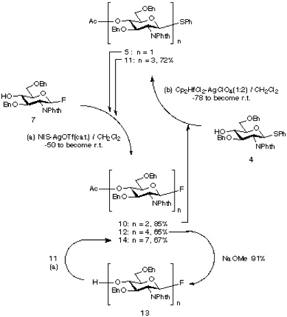 First, thioglycoside donor 5 was coupled with acceptor fluoride 7 under condition (a) to give disaccharide fluoride 10 (85%) which was then reacted with the acceptor 4 to produce 11 [condition (b), 72%]. Subsequent reaction of 11 with 7 [condition (a), 65%] gave tetrasaccharide 12. Having accomplished the stepwise synthesis of a tetrasaccharide, we next examined a block condensation approach. Tetrasaccharide acceptor 13, prepared by Zemplen deacetylation of 12, was coupled with its precursor 11 to give compound 14 [condition (a), 67%], which is again ready for further use as a oligosaccharide donor.