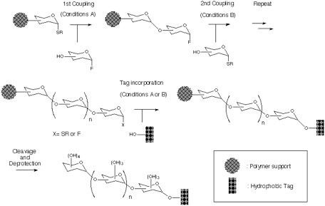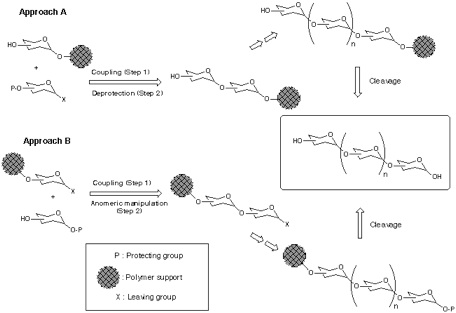 In polymer-support synthesis of oligosaccharide, two approaches can be considered with respect to the direction of chain elongation (Scheme); from reducing end to non-reducing end (Approach A), and from non-reducing end to reducing end (Approach B). Among them, the former approach is generally considered to be more advantageous because, as far as both polymer-supported aglycon and glycosyl donor are reactive enough to ensure completion of all glycosylations (step 1), and selective deprotection to liberate the hydroxy group for the next glycosylation (step 2) can be performed quantitatively, nearly homogeneous product can be obtained. On the other hand, the application of Approach B is less straightforward in principle, due to the considerations that follows. First, every glycosylation (step 1) inevitably gives rise to side reaction(s) (-elimination, hydrolysis, etc.) together with the formation of desired O-glycoside bond, and all products should be accumulated on the polymer supported phase. In addition, transformation of the reducing-end anomeric position into certain leaving group (step 2) is required after each glycosylation, which is by no means straightforward at oligosaccharide stage.