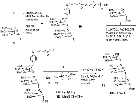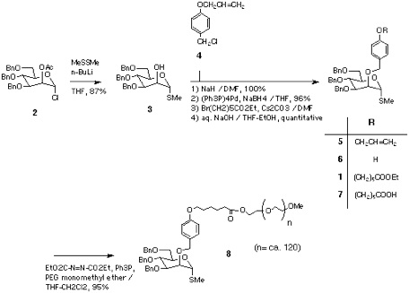 The synthesis was started from the ester 1, that was prepared from the chloride 2[9] via 3, 5, and 6. Saponification into acid 7, followed by coupling with PEG monomethyl ether (Aldrich, average MW 5,000) afforded the thiomannoside-polymer conjugate 8[10].