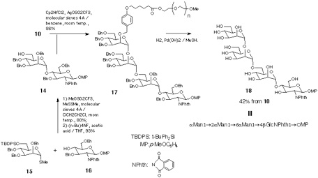 Disaccharide-PEG 10 was also converted into the tetrasaccharide 18 that corresponds to the partially protected form of the common carbohydrate structure of glycosyl phosphatidyl inositol (GPI) anchor[19]. Thus, the disaccharide 14 was synthesised from monosaccharide derivatives 15 and 16 and then reacted with 10, in the presence of Cp2HfCl2-AgOSO2CF3 in benzene[20]. Resultant tetrasaccharide-PEG conjugate 17 was subjected to catalytic hydrogenation. In this case, existence of p-methoxyphenyl and phthalimido groups makes the product hydrophobic enough to be retained in a C18 column. Thus, reverse-phase chromatographic separation, in a similar manner as described for 13, gave tetrasaccharide 18[17, 21] in 30% overall yield (Scheme 4).