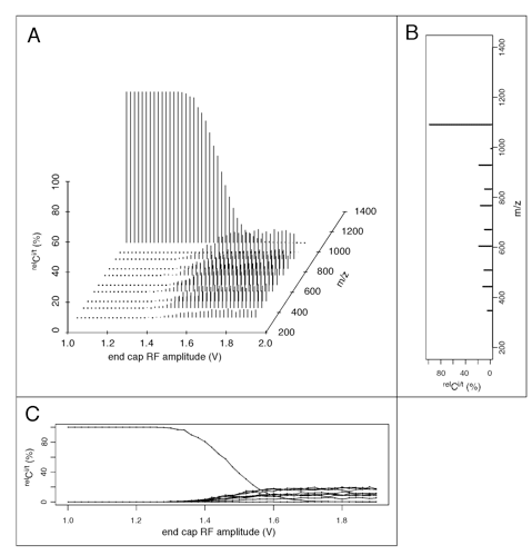 Only the precursor ion is activated under CID conditions when QIT-MS is used. For this reason, we usually obtain ERMS spectra consisting of a series sigmoidal curves. This means that the formed fragment ions does not serve as a precursor for further dissociations. On the other hand, more complex ERMS spectra are generally obtained when the triple quadrupole (TQ)-MS is used, because all the ion species including the product ions are subjected to CID conditions.